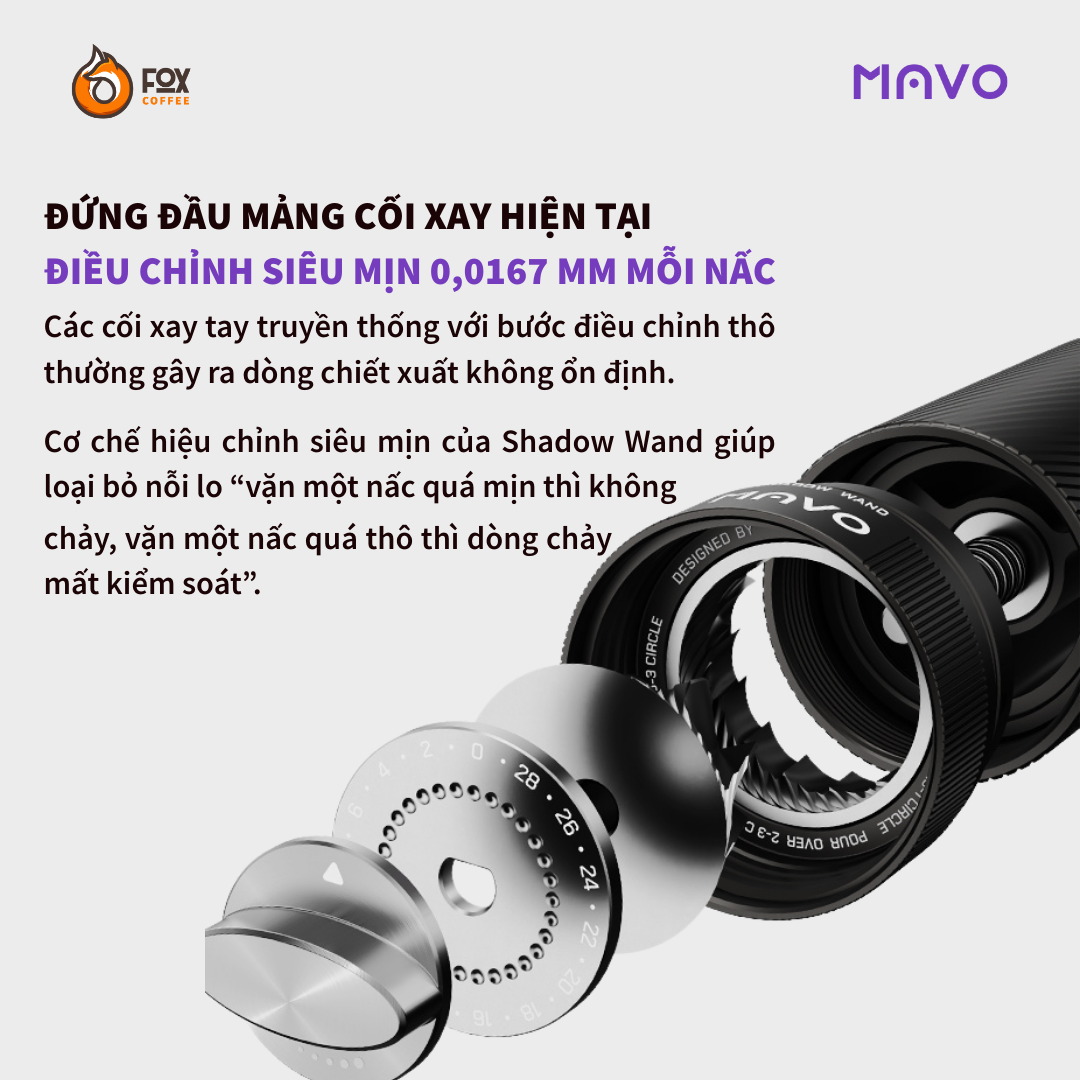 MAVO Shadow Wand là mẫu máy xay cà phê cầm tay thế hệ mới, được thiết kế chuyên biệt cho espresso với độ chính xác cực cao, hiệu suất vượt trội và trải nghiệm xay mượt mà. Trang bị lõi xay ShadowBlade 38mm độc quyền, hệ thống hiệu chỉnh siêu mịn 0.0167mm mỗi nấc, và kết cấu kim loại nguyên khối – đây là lựa chọn lý tưởng cho barista chuyên nghiệp và người yêu cà phê muốn kiểm soát tối đa quá trình chiết xuất.